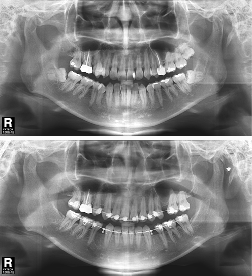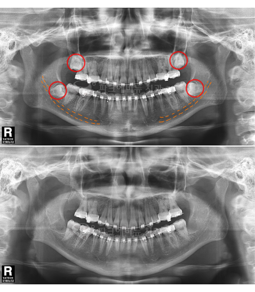 위 두 환자는 교정치료를 위한 공간확보가 필요하여 사랑니 발치를 하게 되었다. 아래턱에 점선으로 표시 되어있는 하치조신경 다발이 사랑니 뿌리에 근접하여 지나가서 난이도가 높은 수술이었지만 3차원적 영상인 CT와 Panorama X-ray를 정밀 분석하여 발치 한 결과 신경 손상 없이 발치 할 수 있었다. 또한 두 환자 모두 “PRF(자가골성장인자)”를 이용해 사랑니 발치를 하여 부작용을 최소화 하였다.