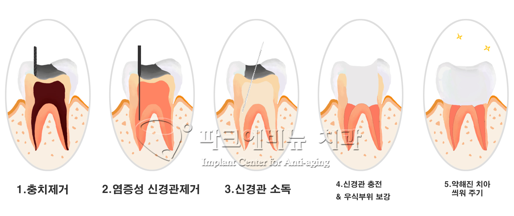 여기서 보통 사람들은 3단계에서 증상을 인지하고 치과를 가게 된다. 그러나 이 단계가 지나고 4단계에 이르러 더 이상 치아에 아무런 통증을 느끼지 못하면, 그대로 방치하게 되는 것이다. 이런 경우 충치는 끝 없이 뿌리를 향해 파고들어 치아를 발치 해야 하는 일이 부지기수다. 충치신경치료는 발치 전 마지막으로 치아에 할 수 있는 보존적인 치료라고 할 수 있다. 이런 신경에 문제가 생긴 치아가 제 기능을 할 수 있도록 지키기 위해서는 신경 치료를 하여 뿌리 끝 염증과 염증에 이환 되어있는 치수를 제거하고 치아를 단단하게 씌워주어야 한다.
