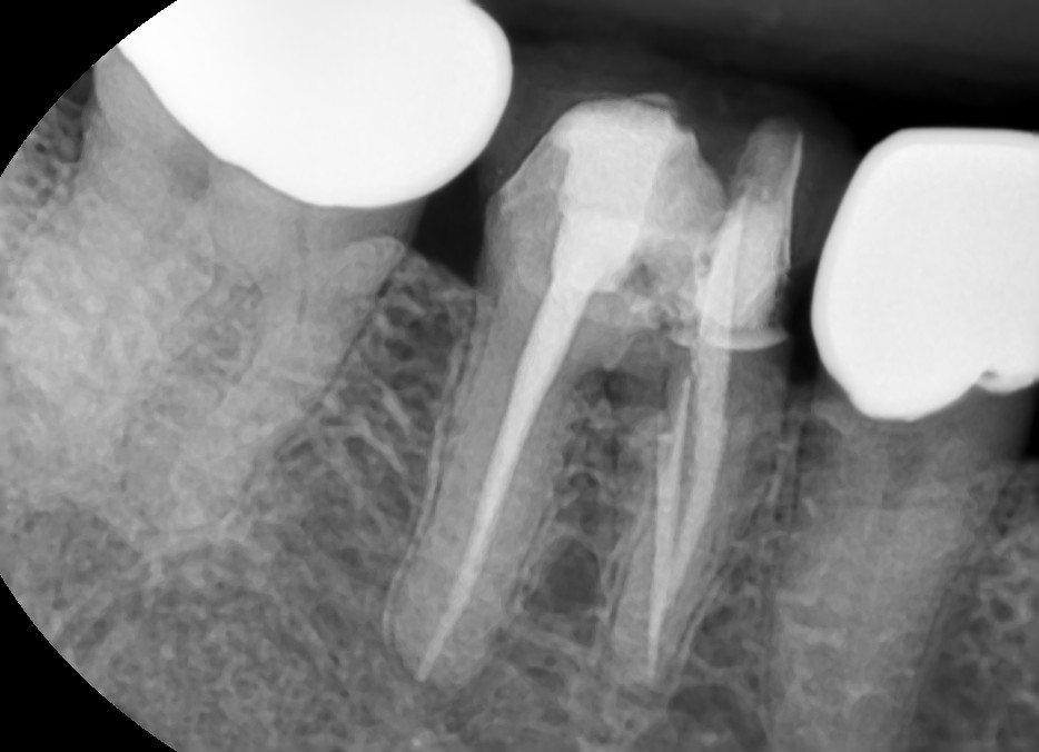 해당 치아의 보철물을 제거하고 신경치료 를 다시 한 방사선 사진입니다.