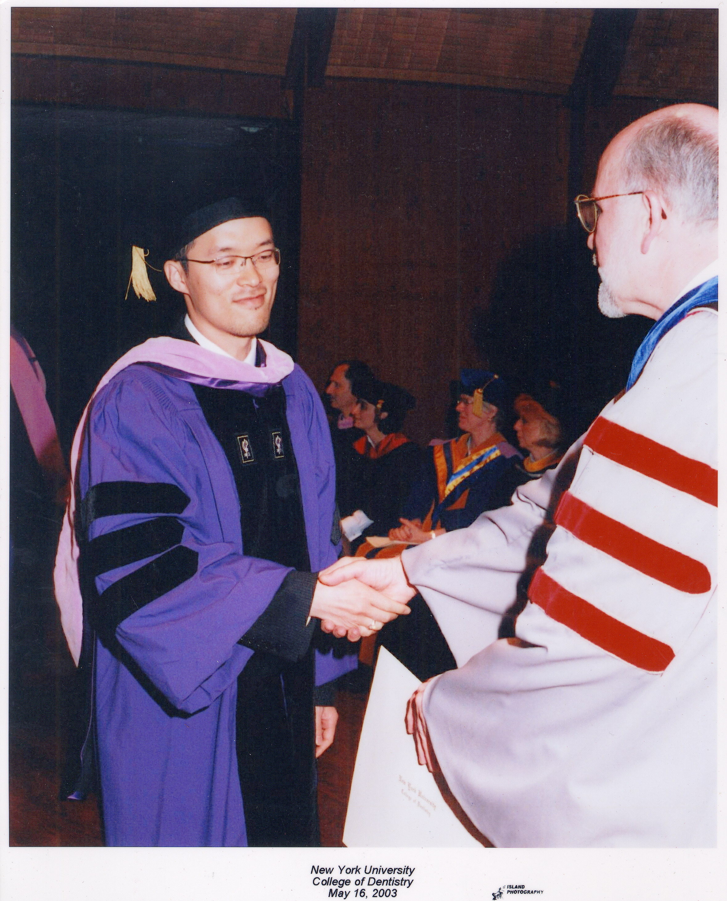 보철과 졸업식에서 Dr.Eisenberg와 Dr.Wolfe의 축하를 받으며